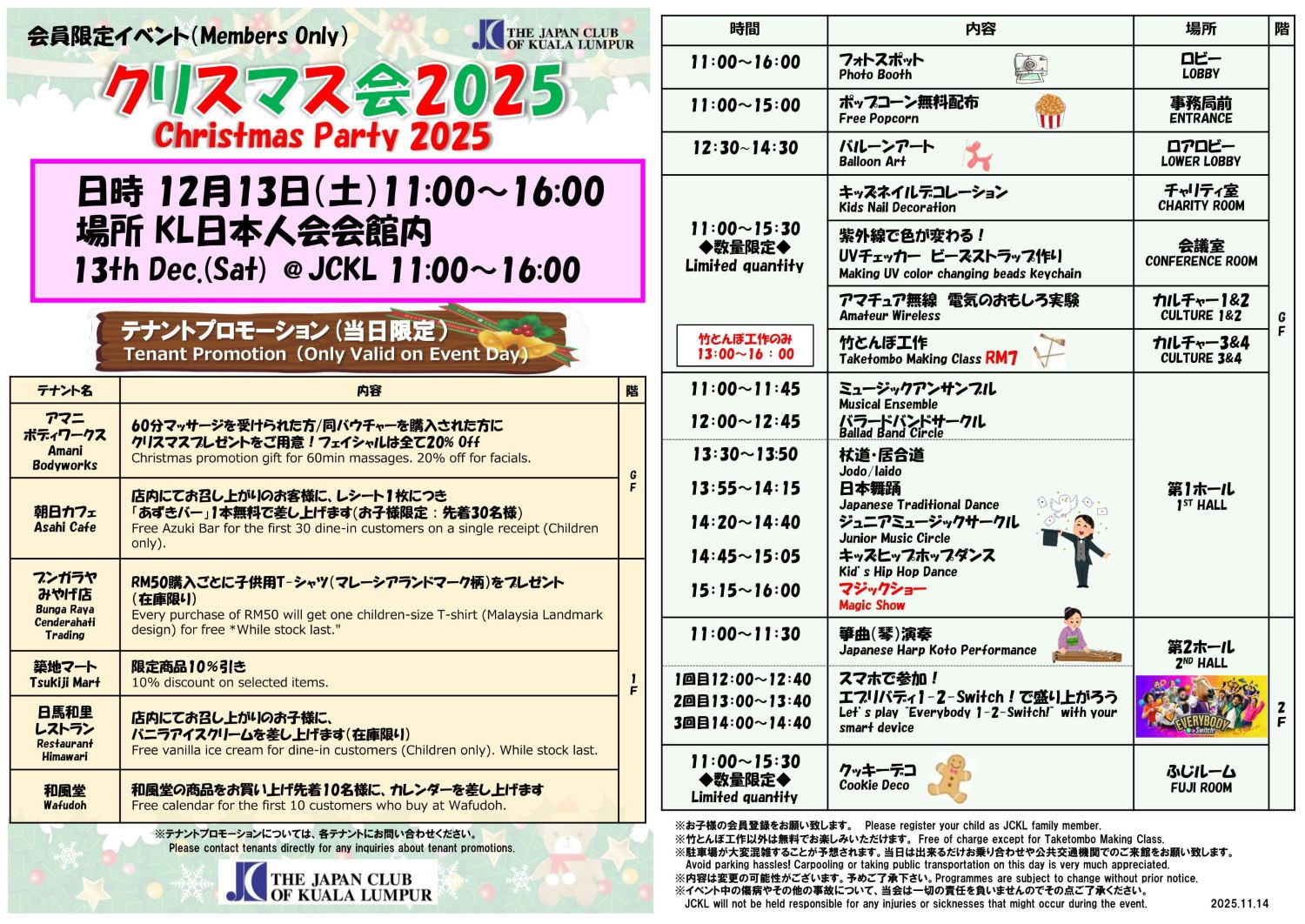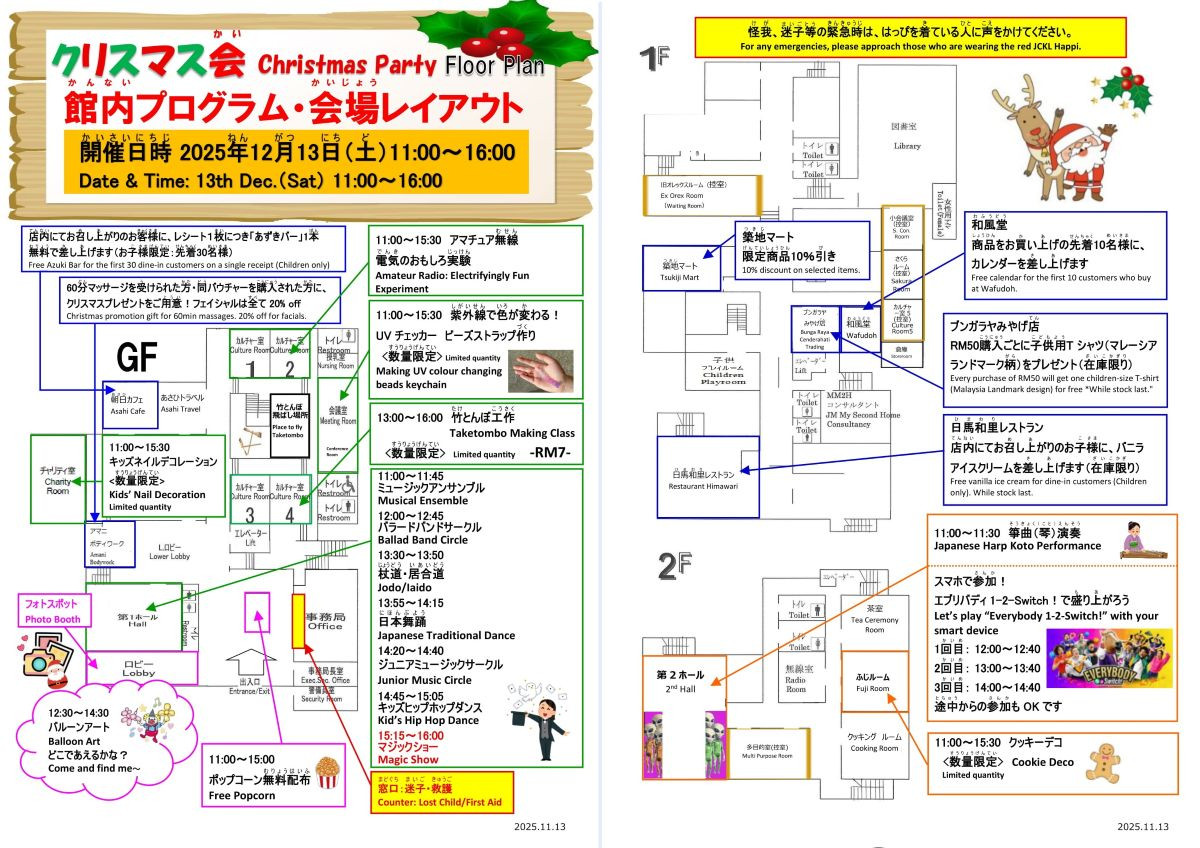 12月14日 (土)、日本人会会館にて恒例のクリスマス会を開催し、1,100人 を超えるご来場がありました。大人から子どもまで楽しめる多彩な企画やパフォーマンスが行われ、多くの来場者が一足早いクリスマスを楽しみました。