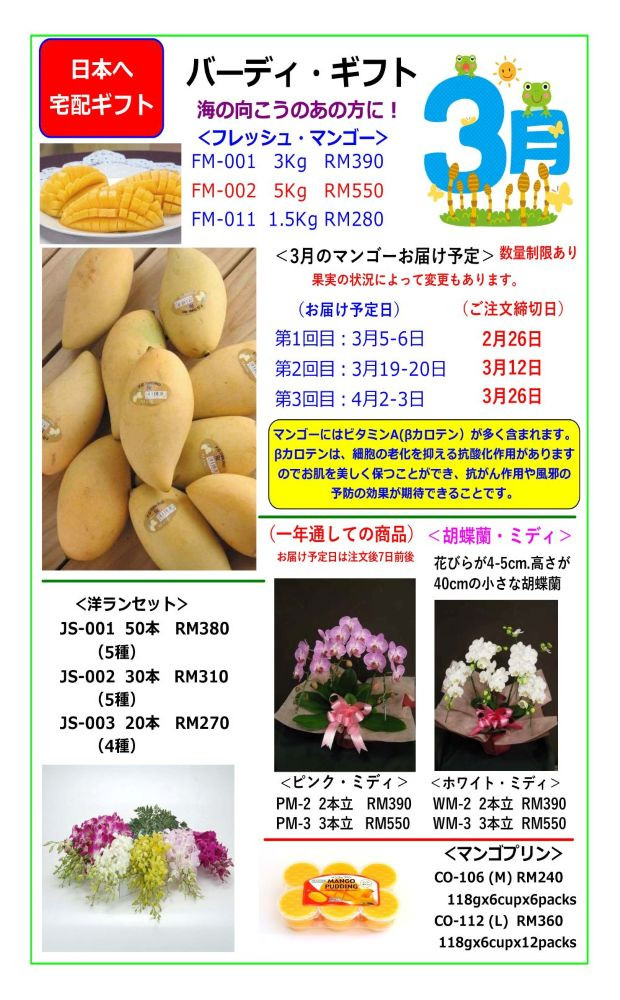 生マンゴー、洋蘭の切り花、胡蝶蘭の鉢植え、マンゴープリンを日本のお宅までお届けします。