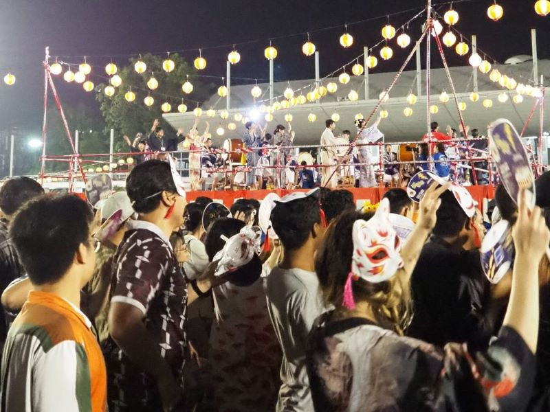 陽が傾き始めた頃、来場者が会場内に並ぶ屋台で楽しむのんびりムードの中、ドンッドンッドンッと呼び込み太鼓が響き渡ると、湧き上がる大歓声!やぐらでは太鼓奏者と踊り手を任された日本人学校の中学3年生、そして現地校の生徒たちが踊りをリード。にぎやかな祭囃子が流れると、やぐらを中心に幾重にも踊りの輪が広がっていく。