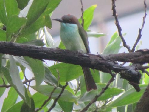 スズメよりも一回り大きい。頭が茶色、のどが水色で、背中は緑。ハチクイの名前の通り、飛んでいる昆虫をつかまえて食べる(写真はKLCC公園)