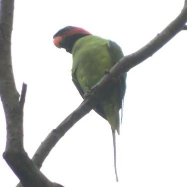 体の大きさは40cmくらい。顔が赤く、喉が黒い。体は緑。大きな木に2~3羽が一緒にいる(写真は天后宮駐車場)