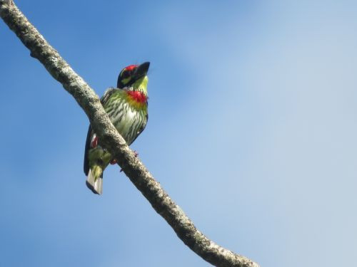 スズメと同じくらいの大きさ。高い木にいて、木の実や昆虫を食べる。頭と背中が緑で、腹は緑のまだら。ひたいが赤くて、目の周りが白と黒でかわいい(写真はKLレイクガーデン)
