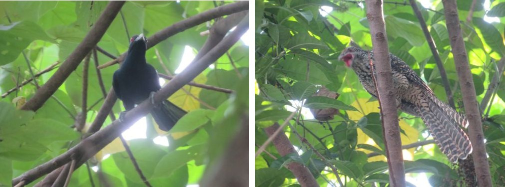 40cmくらいで、マレーシアのカラスと同じくらいの大きさ(マレーシアのカラスはイエガラス House Crow 家鴉 と言って、日本のカラスよりも一回り小さい)。オスは真っ黒、メスや未成鳥は茶色のまだらで、くちばしが黒ではなく目が赤い。大きな木で、大きな声でよく鳴いている(写真は天后宮周辺)